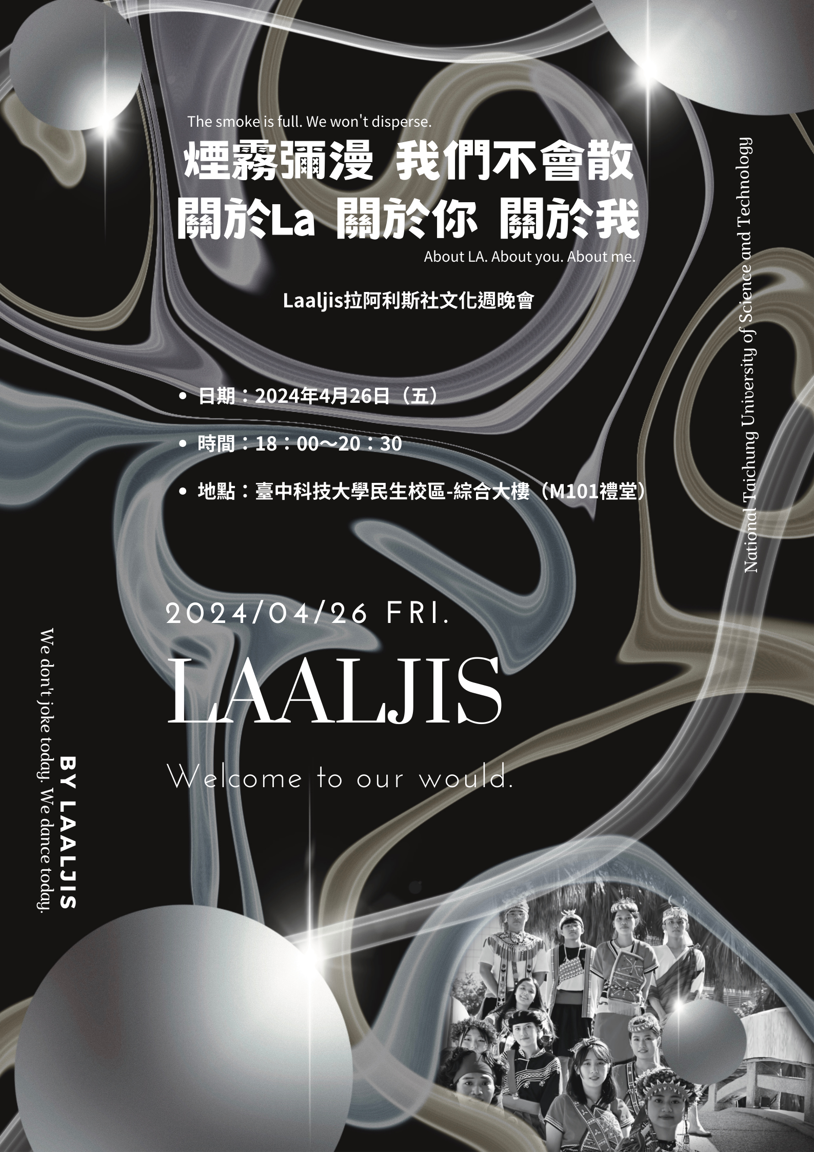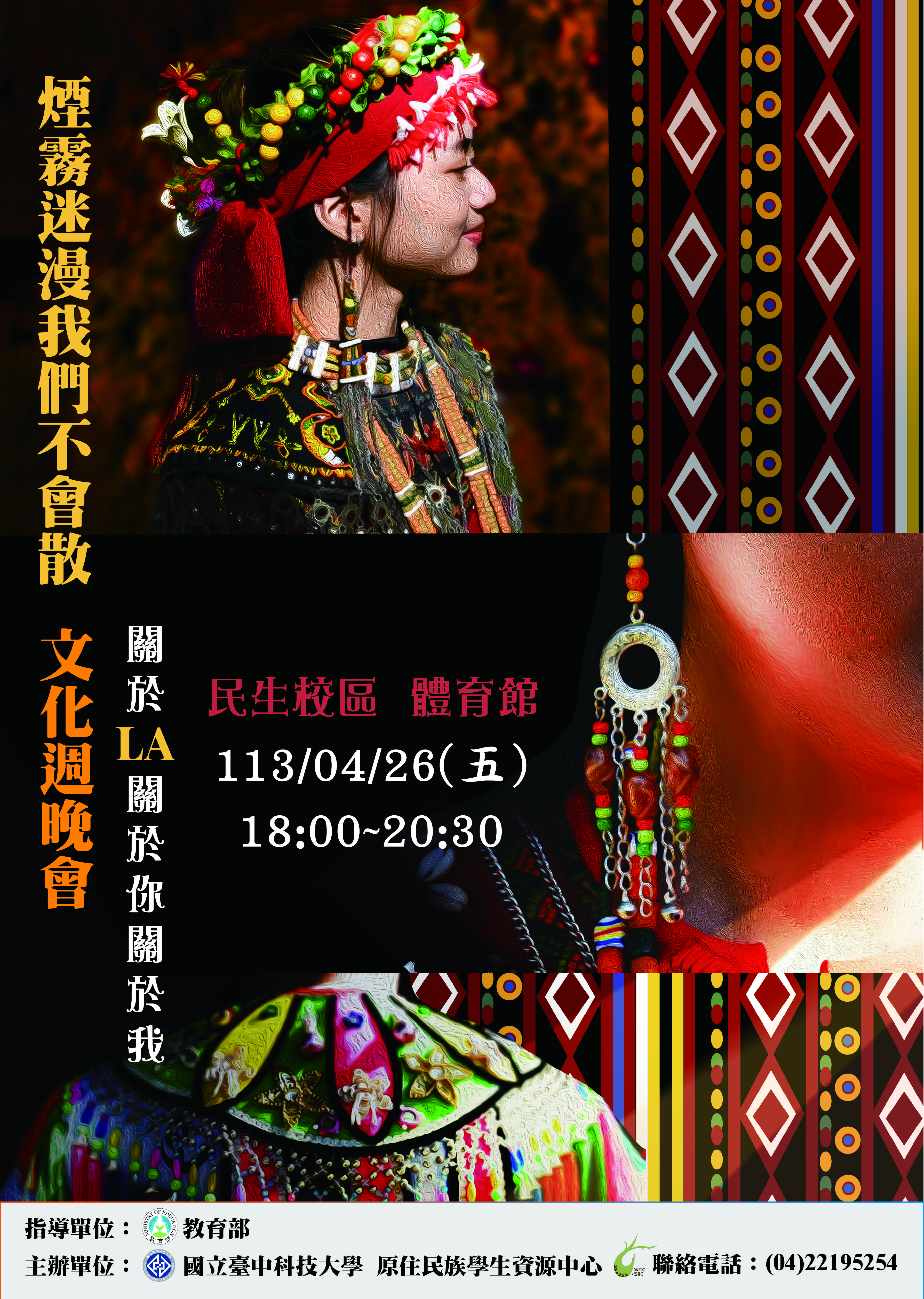 主旨:本校原住民族學生資源中心於113年4月26日舉辦「112學年度第2學期原住民族文化週晚會《關於LA 關於你 關於我》」,敬邀貴校師生及推動原住民族事務相關單位參加,並請公告及惠允相關人員公(差)假出席,請查照。
