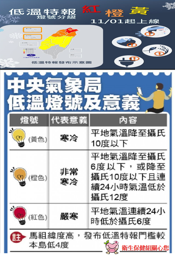 交通部中央氣象局將自本(108)年11月1日起以黃、橙、紅3級燈號發布低溫特報。