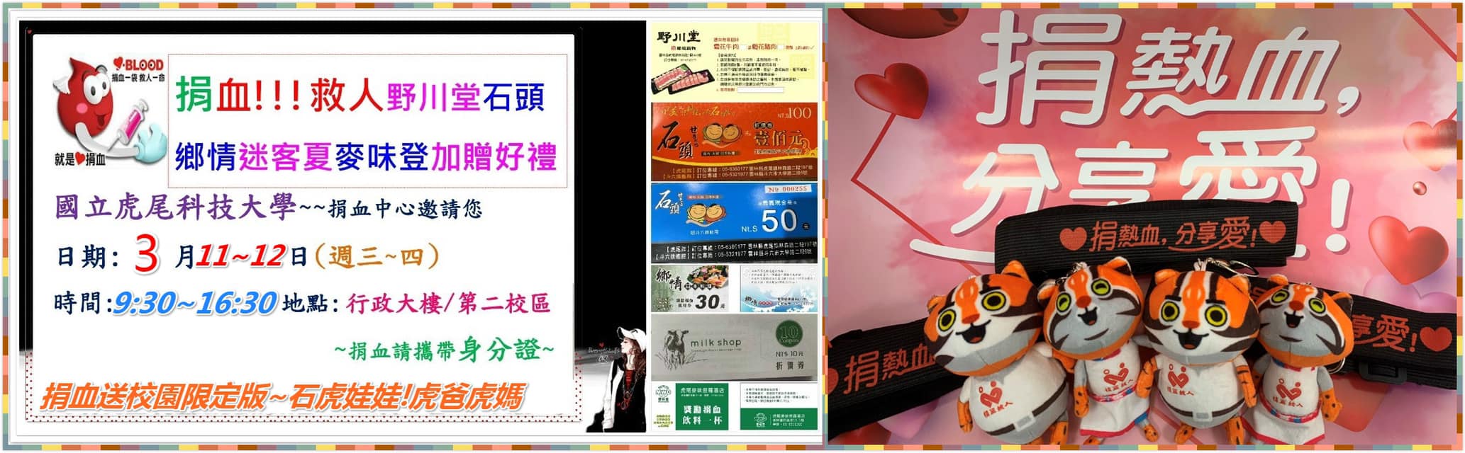 109/3/11-12校園捐血活動時間:9:30-16:30地點:行政大樓前停車場、第二校區入口捐血贈送各項禮券、虎爸虎媽布偶