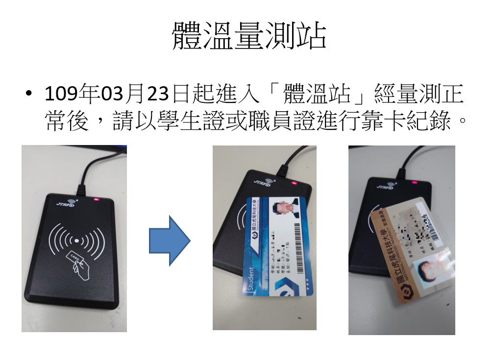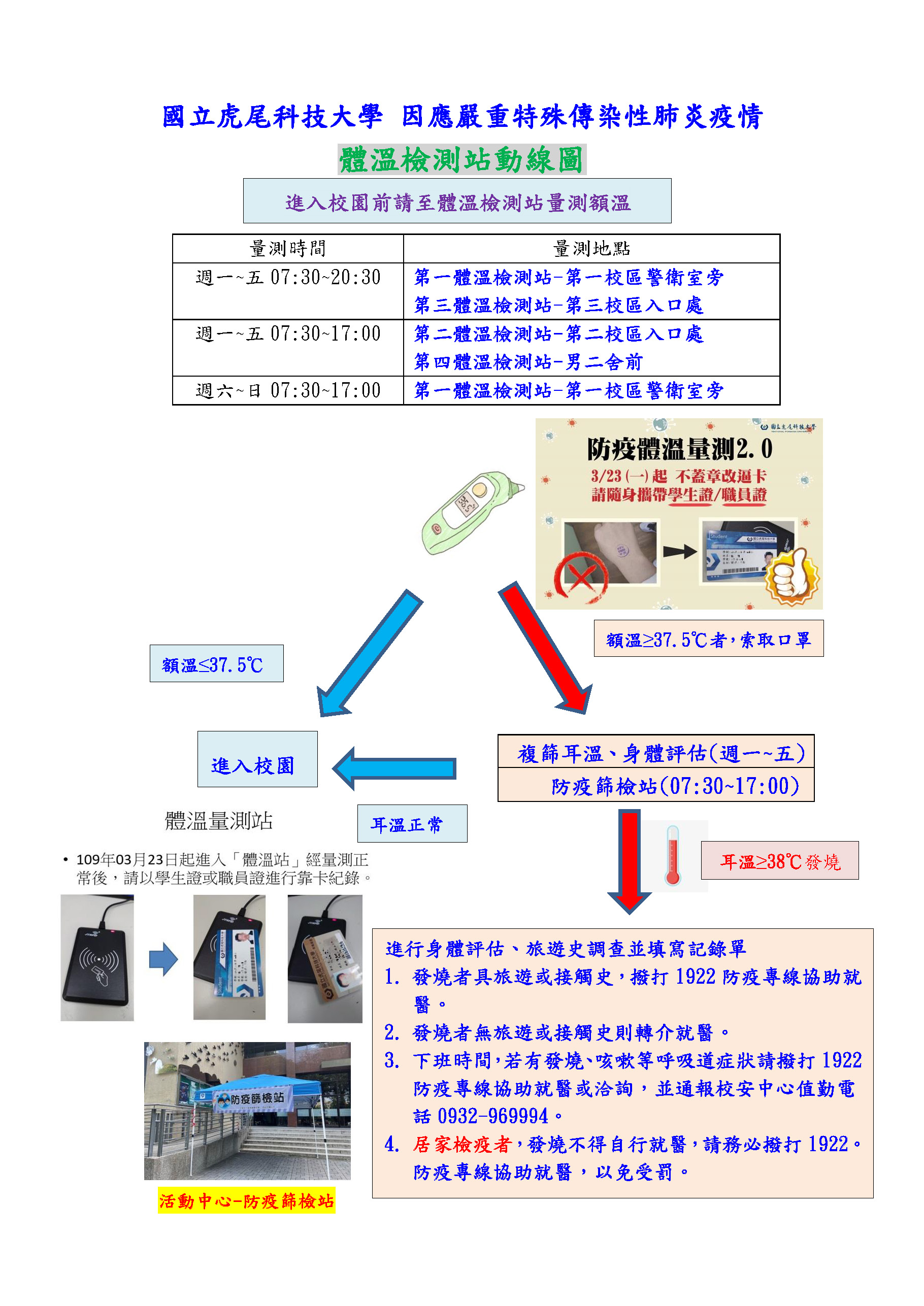 因應校園防疫工作,自109/3/23(週一)起,請攜帶於學生證/教職員證,前往各體溫站量測體溫,
