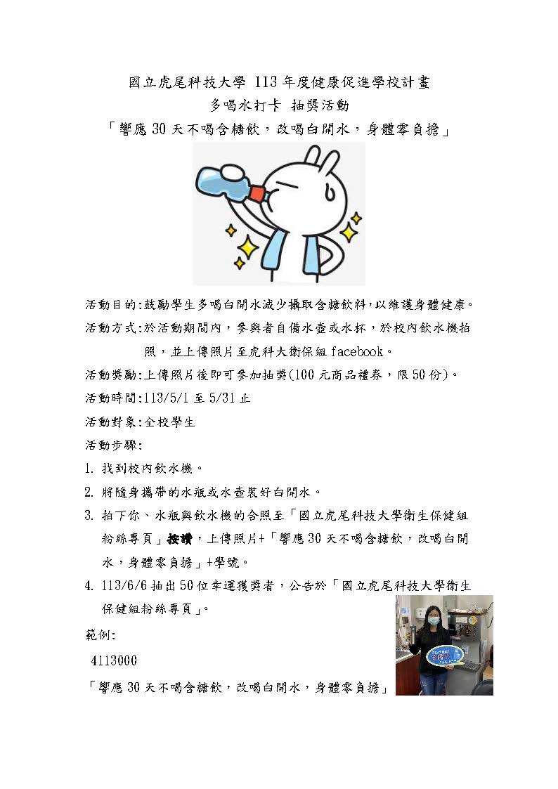 3. 拍下你、水瓶與飲水機的合照至「國立虎尾科技大學衛生保健組粉絲專頁」按讚,上傳照片+「響應30天不喝含糖飲,改喝白開水,身體零負擔」+學號。