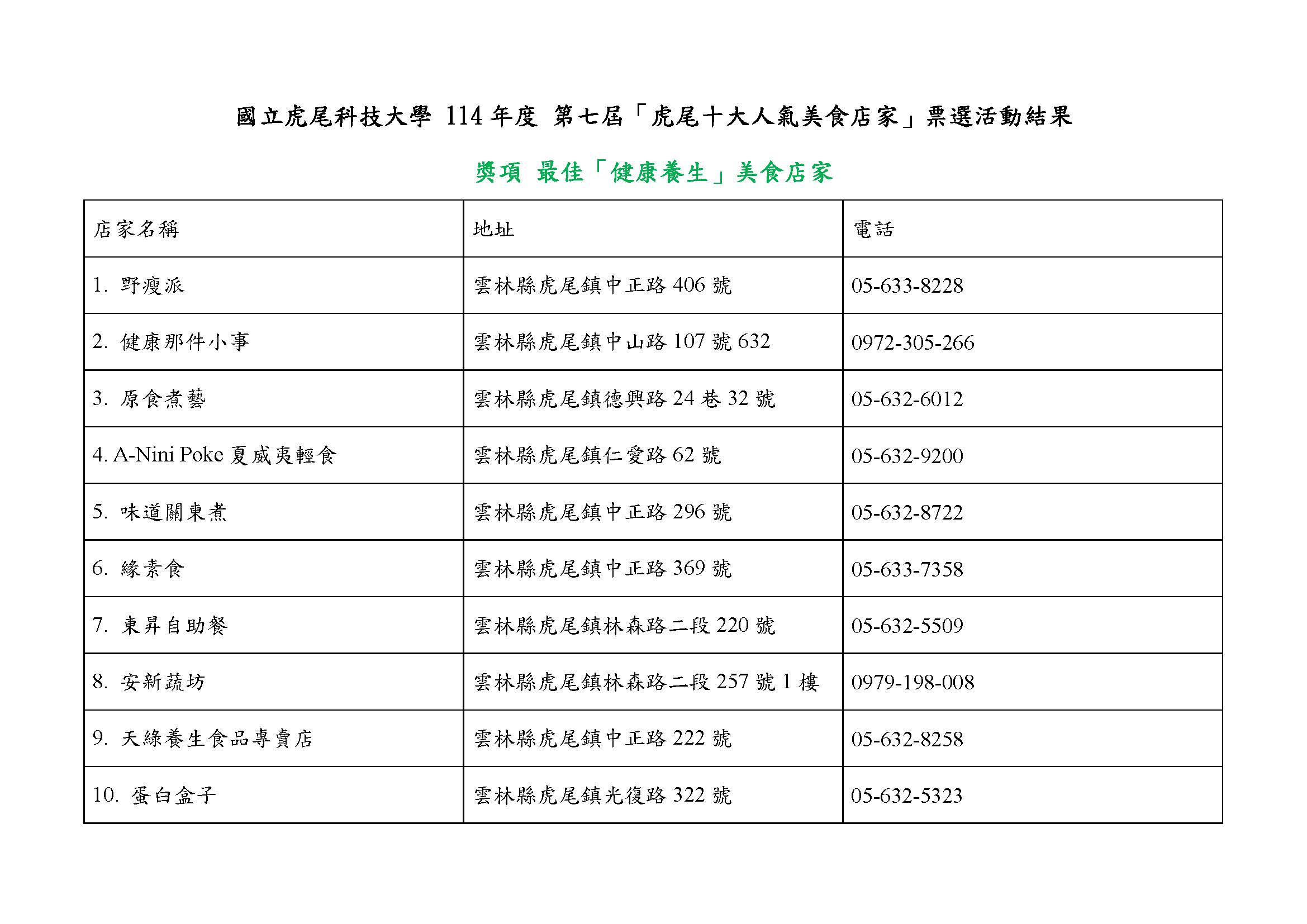 .教育部學校衛生資訊網.衛生福利部疾病管制署 .AED急救資訊網 .活動報名.109年度雲林縣餐飲衛生及管理分級 評核油品安心標章.109年度第三屆「虎尾十大人氣美食店 家」票選結果出爐.109年度餐飲衛生管理分級評核優等店 家.109年度餐飲衛生管理分級評核優等-虎 尾地區.109低油、低鹽、健康飲食、週二蔬食 日健康講座