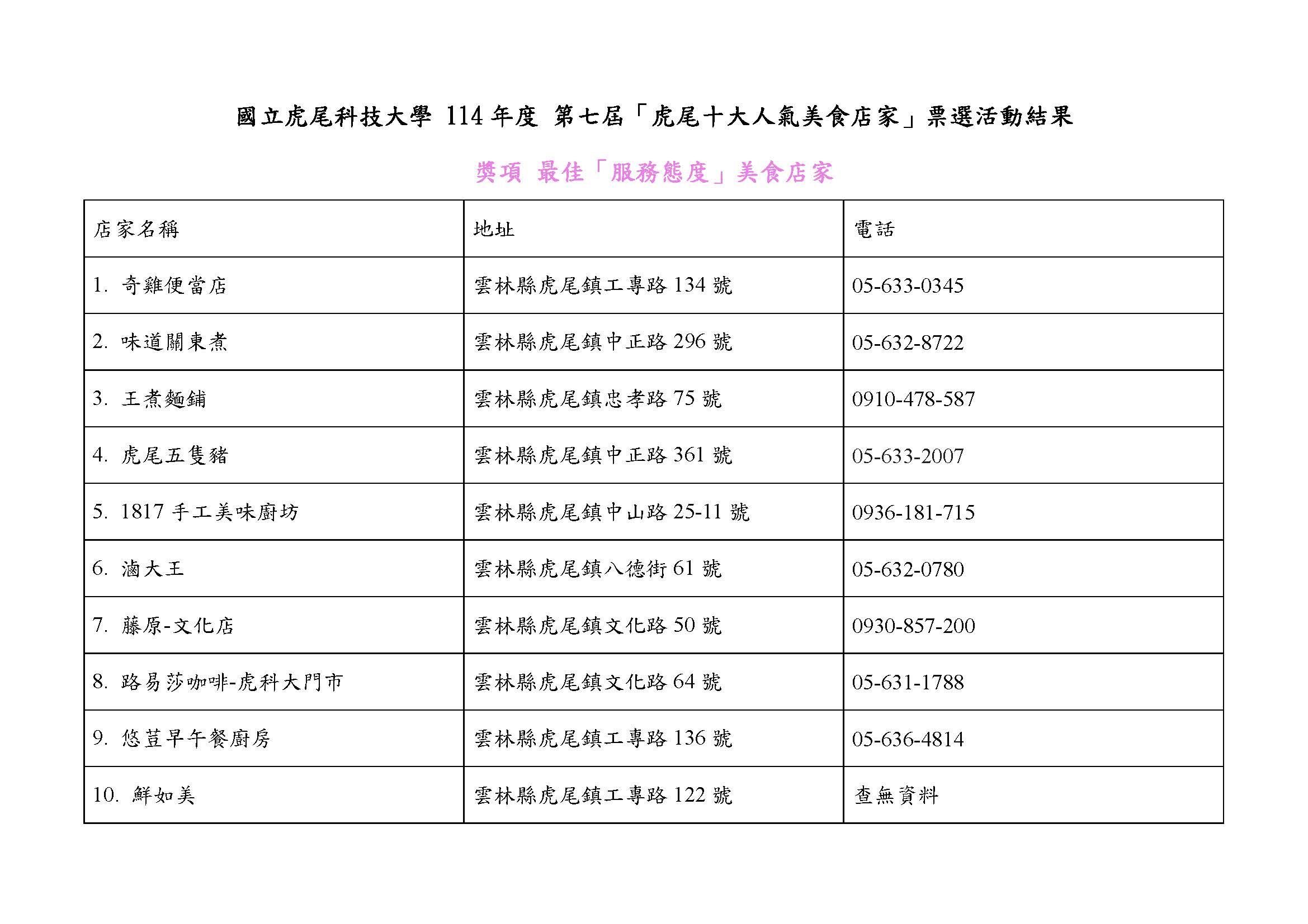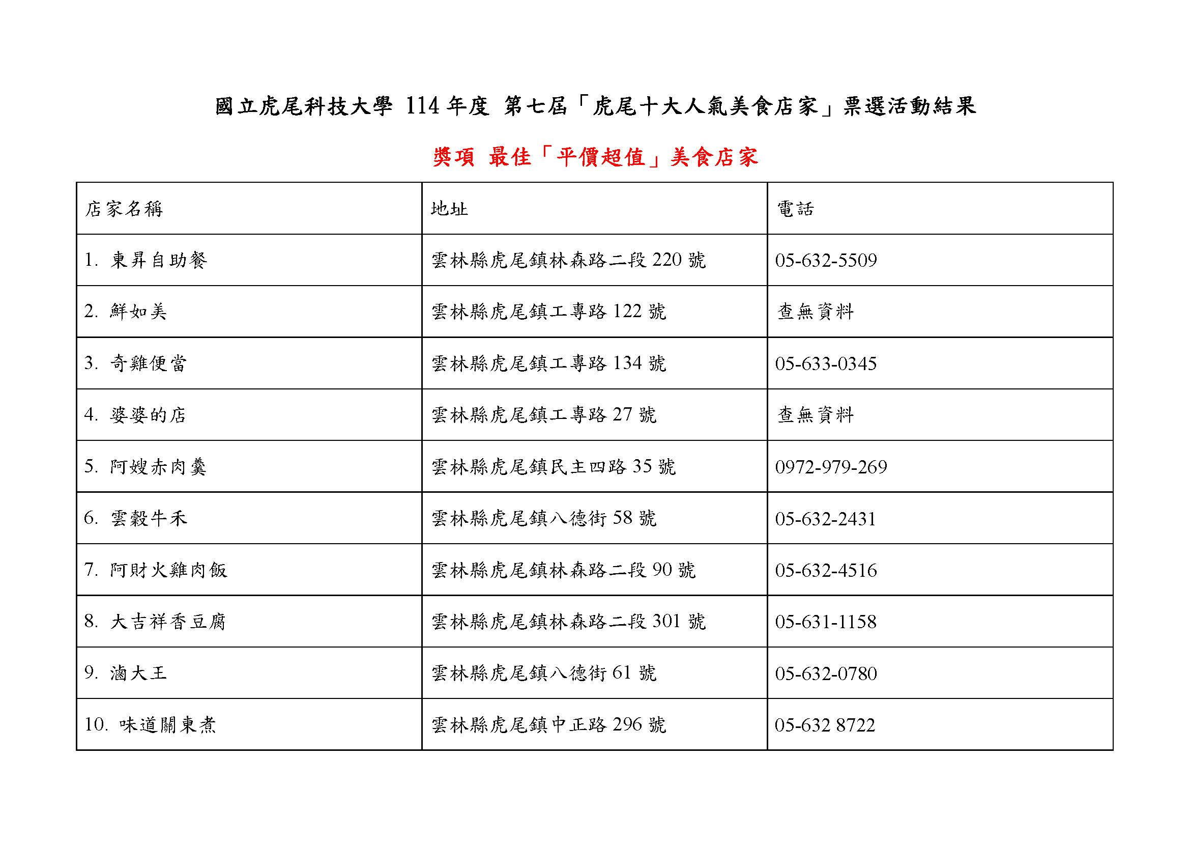 第七屆「虎尾十大人氣美食店家票選」結果公告
