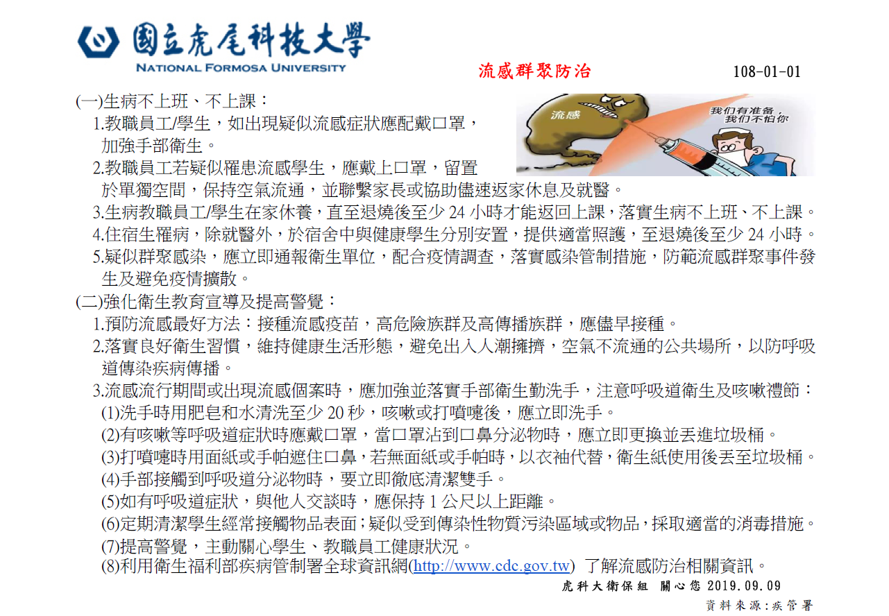 傳染病管制原則,主要有消滅傳染源、切斷傳染途徑及保護易感染性宿主等方法。因此校園防疫工作,應包含改善環境衛生、施行預防接種、預防直接傳染(早期發現,早期隔離)、實施衛生教育四大要項,且建立一份標準化處理流程,才能迅速與有效遏止傳染病蔓延。