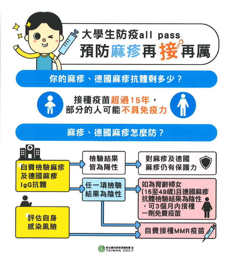 二、為提升青年族群免疫力,進而防堵麻疹、德國麻疹病毒自國外入侵及於國內傳播,衛生福利部傳染病防治諮詢會預防接種組(ACIP)建議應積極宣導大學生預防觀念,同時提醒可自費檢驗抗體,如任何一項為陰性,建議接種MMR疫苗。