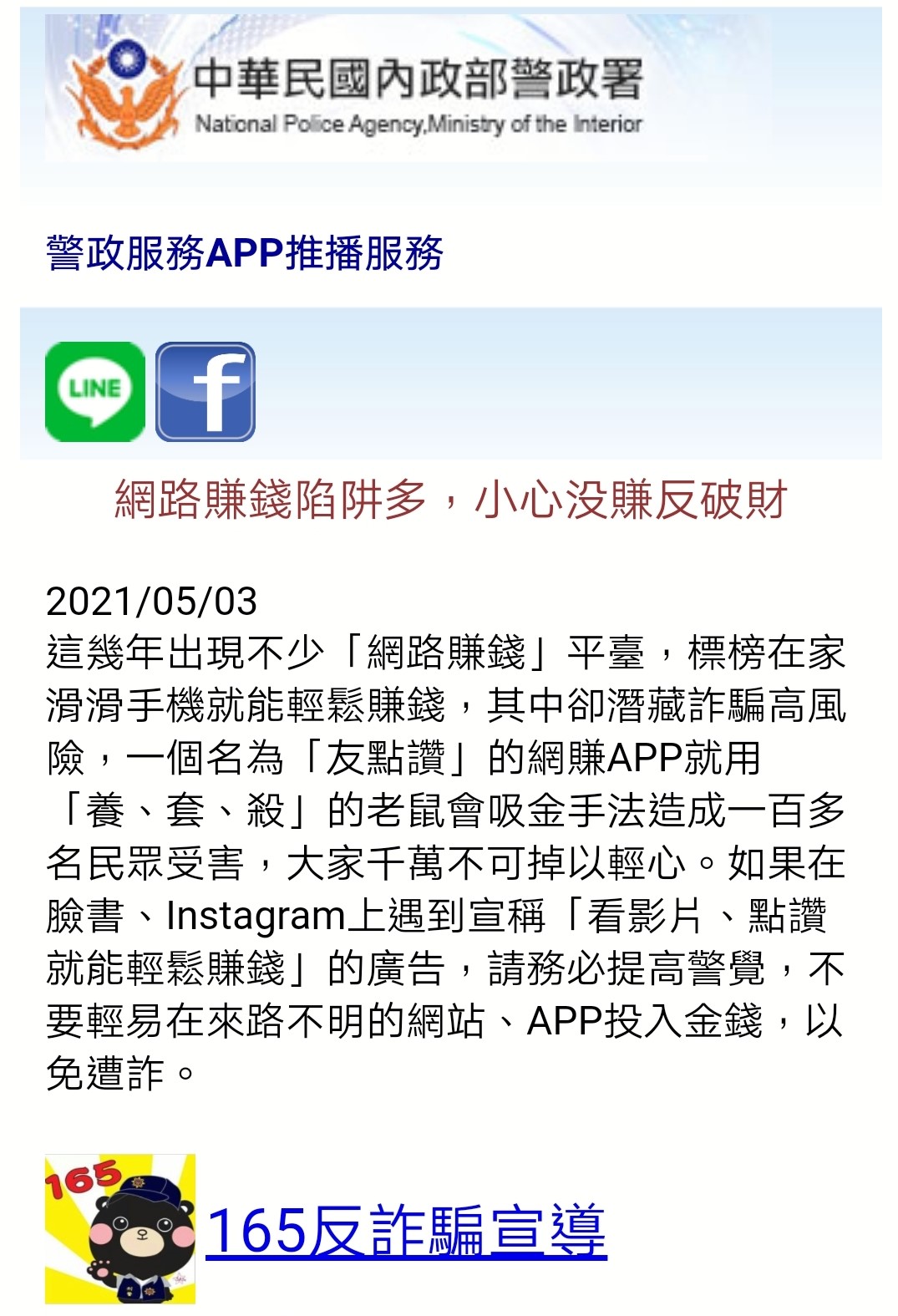 提醒年輕朋友們,如果在臉書、Instagram上遇到宣稱「看影片、點讚就能輕鬆賺錢」的廣告,請務必提高警覺,不要輕易在來路不明的網站、APP投入金錢,以免遭詐。